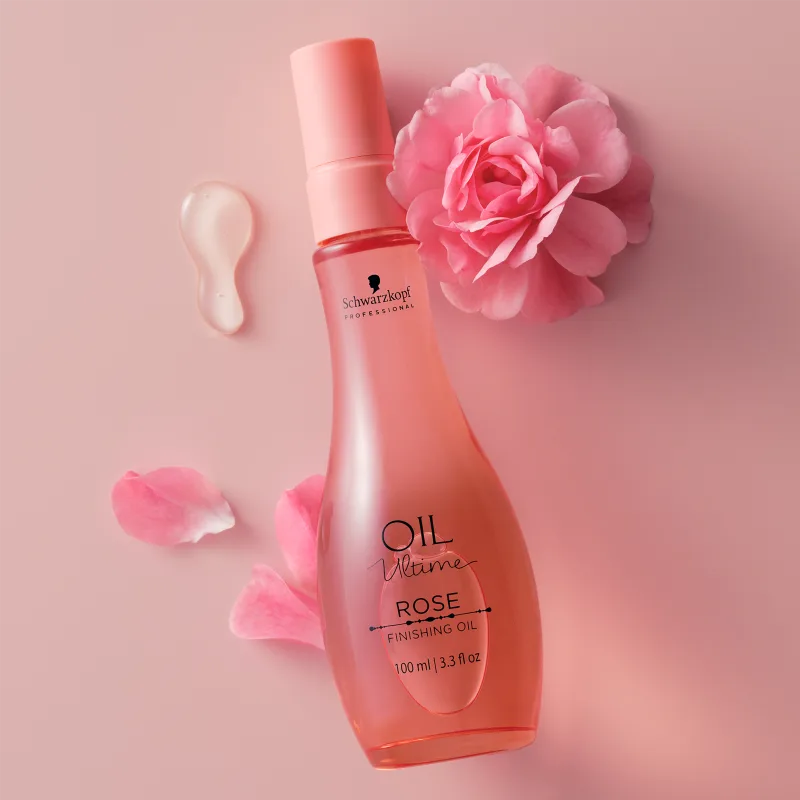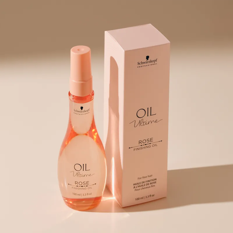 Óleo finalizador para cabelos finos a equilibrados. Schwarzkopf Professional Oil Ultime Rose, envolve gentilmente o fio para nutrir e suavizar.