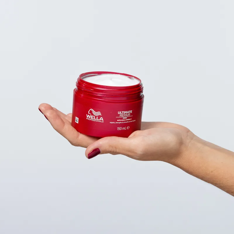 A Máscara Wella Ultimate Repair repara intensivamente, fortalece, hidrata e suaviza todos os tipos de cabelo, sejam naturais, coloridos ou descoloridos. Sua fórmula conta com AHA e Ômega-9, que promovem condicionamento intenso e auxiliam na redução do frizz. Além disso, proporciona 99% menos quebra e 12x mais maciez aos fios.