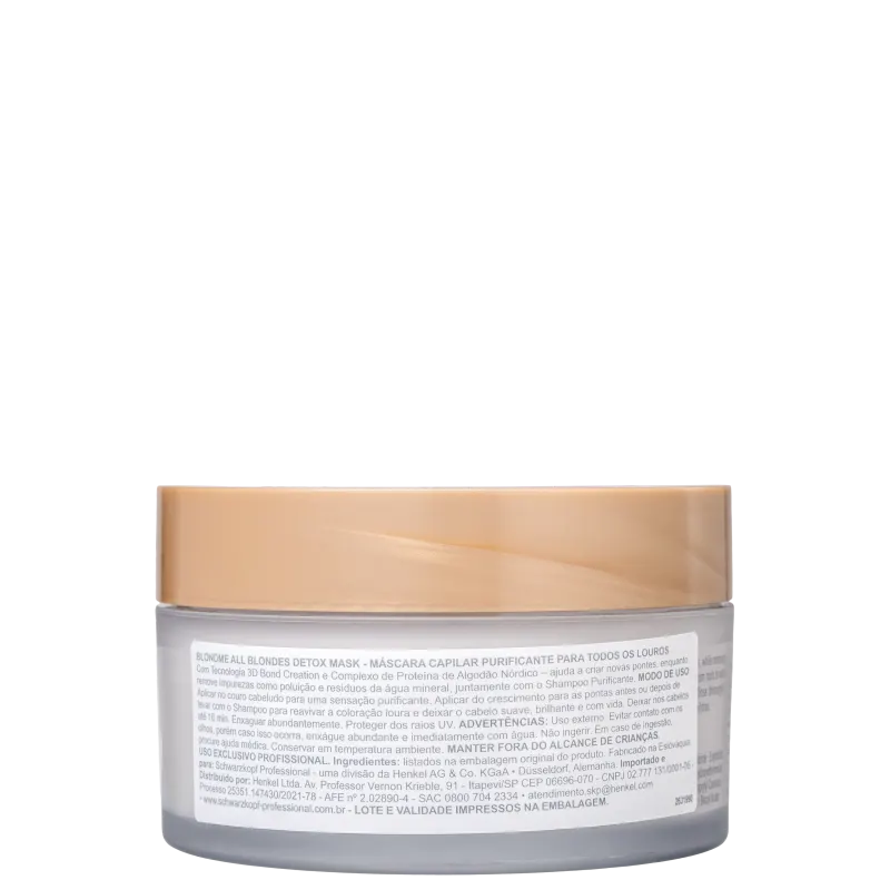 Máscara Capilar Schwarzkopf Professional BlondMe de Tratamento Purificante para Todos os Loiros é um regime de purificação, para todos os tipos de loiros. Conta com Tecnologia 3D Bond Creation e Complexo de Proteína de Algodão Nórdico, para remover impurezas, como poluição e resíduos da água mineral. Revive o cabelo, ao deixar uma sensação de pureza, nutrição e iluminação. Seu loiro ainda mais loiro!